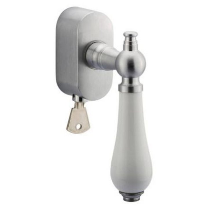 Hochwertige abschließbare Fensterolive für den Innenbereich im britischen 80er Jahre Stil mit Porzellangriff entsprechend deutscher Norm.