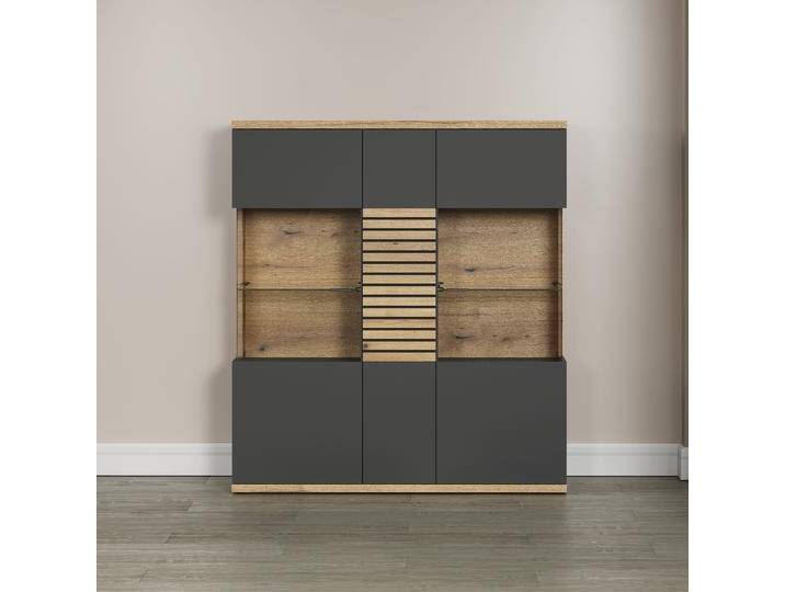 Das Highboard INOSIGN Galway vereint modernes Design mit funktionaler Eleganz und ist die perfekte Ergänzung für dein Zuhause. Mit den Maßen Breite: 131 cm, Höhe: 147 cm, Tiefe: 38 cm bietet es ausreichend Stauraum und setzt gleichzeitig stilvolle Akzente. Die Kombination aus anthrazitfarbenem Melamin und Coast Evoke Oak Nachbildung verleiht dem Highboard eine zeitgemäße Optik, die sich harmonisch in verschiedene Einrichtungsstile einfügt.