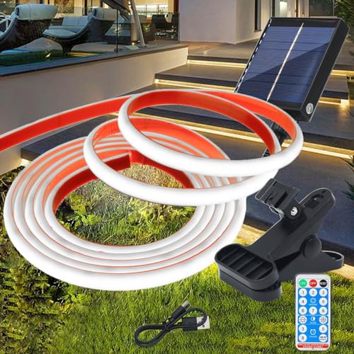 8 Modi, COB Streifen Selbstklebeband: Der LED Streifen verfügt über 8 Beleuchtungsmodi, die Sie nach Ihren Wünschen auswählen können. Der Solarstreifen wird mit einer Fernbedienung geliefert, die Sie zur Steuerung des Streifens verwenden können, oder Sie können ihn mit der Taste auf der Rückseite des Solarpanels einstellen. Die selbstklebende Lichtleiste kann je nach Bedarf draußen oder auf dem Balkon installiert werden. Dimmbare Solar Streifen: Die Solar COB Lichtleiste ist mit einem Solarpanel ausgestattet, das durch die Absorption von Sonnenlicht ohne externe Stromversorgung aufgeladen werden kann. Die Lichtleiste wird ein USB-Ladekabel senden, so dass zusätzlich zur Absorption von Sonnenlicht zu laden, können Sie auch das Ladekabel zum Laden verwenden. Sie können die Fernbedienung verwenden, um die geeignete Helligkeit für den Streifen zu wählen. IP68 Wasserdichte: COB Solarmodule und LED-Lichtleisten sind aus hochwertigen Materialien, langlebig und IP68 wasserdicht, müssen Sie nicht über Feuchtigkeit, regen oder Wasser in das Licht zu kümmern! Langlebiger als andere Solarleuchten für den Außenbereich, perfekt für die Gartendekoration im Freien. Weit Verbreitet: Die Breite des COB Streifens beträgt 10mm, das schwarze Stromkabel ist ca. 1.2 m. Der wasserdichte, selbstklebende COB-Streifen wird häufig in Gärten, Bäumen, Büschen, Höfen, Veranden, Zäunen und anderen Dekorationen verwendet.Ideal auch für die Dekoration von Weihnachten, Partys, Hochzeiten, Bühne Einfache Installation: Der flexible Solar COB Streifen kann in jedem beliebigen Winkel gebogen werden, und Sie können ihn auch auf die gewünschte Länge zuschneiden (alle 2.5cm können einmal geschnitten werden), einfache und schnelle Installation, keine Notwendigkeit für komplexe Verkabelung.