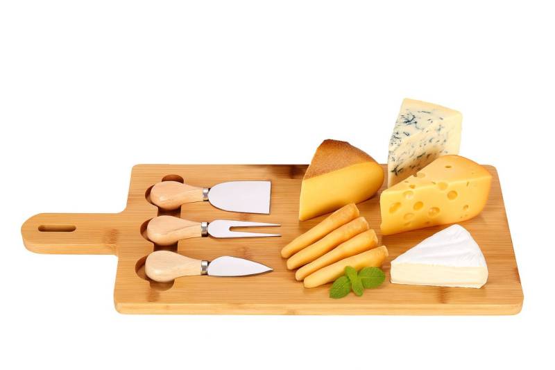 Set: Bambusbrett +, 3 Käsewerkzeuge (Messer, Gabel, Spachtel)
