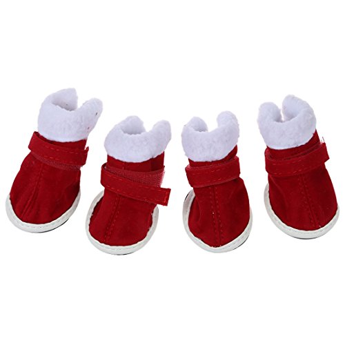 Produktname: Hundeschuhe; Größe: 5 Material: Kunstleder, Wildleder, Plüsch, Gummi Einheitsgröße: 6,7 x 5,4 cm; Höhe: 6,5 cm Größe der Pfote in Form: 5,7 x 4,4 cm (L x B); Hauptfarbe: Rot, Weiß Nettogewicht: 76 g; Lieferumfang: 4 x Veloursstiefel