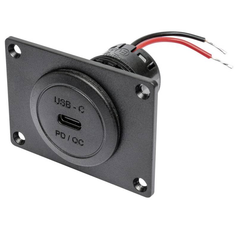 Power USB-C Einbausteckdose PD/QC 60 Watt 12-24 V DC. Perfekt für schnelles und mobiles Laden von Tablets, Notebooks und Smartphones der neuesten Generation. Mit integriertem Spannungswandler und Step-Up-Converter: Bei Eingangsspannung 12 Volt können kompatible Geräte mit einer Ausgangsspannung von 5-20 Volt und einer Leistung von bis zu 60 Watt geladen werden.