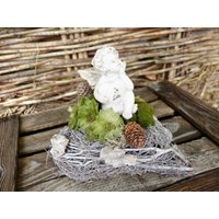 Dieser herzförmige Grabschmuck ist eine besondere Dekoration für Totensonntag oder Allerheiligen. Es wird als haltbarer Schmuck für den Winter auf dem Grab abgelegt. Auf einer Unterlage aus hellem Rebengeflecht ist eine grüne Sukkulente zusammen mit rustikalen Zapfen etwas Grünmoos dekoriert. Die Mitte betont eine weißer Engel mit der Aufschift „In Liebe" Durchmesser ca. 22cm Länge von oben nach unten ca. 25m Höhe ca. 15cm Dieses Gesteck ist aus haltbaren natürlichen und künstlichen Materialien und bleibt den ganzen Winter bis in den Februar-März hinein ansehnlich. Allerheiligen Gestecke Grabschmuck Grabdeko Urnengrab Dekoration Gedenken Trauergestecke Herbst Grabgesteck Grabgestecke Engel